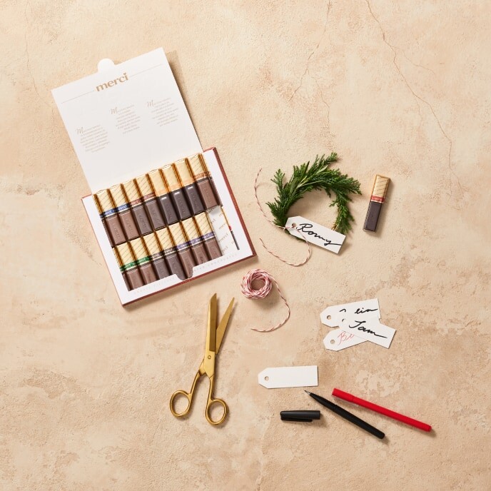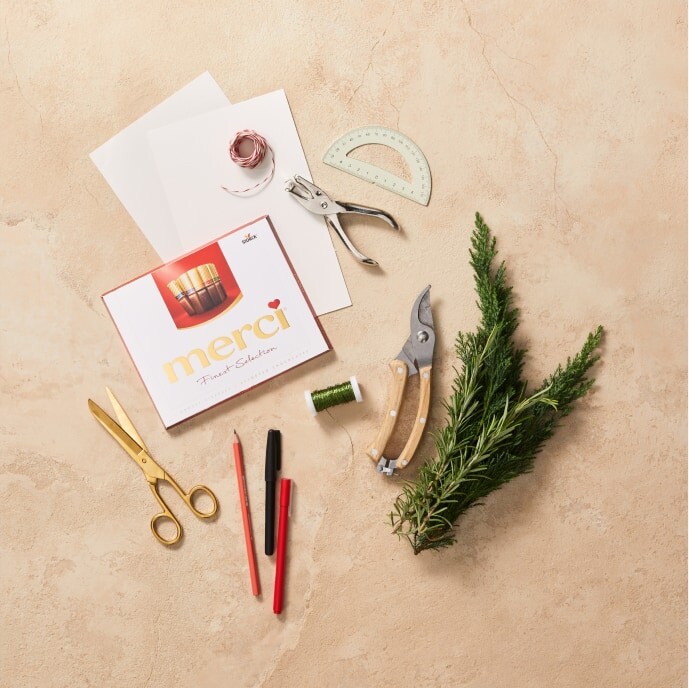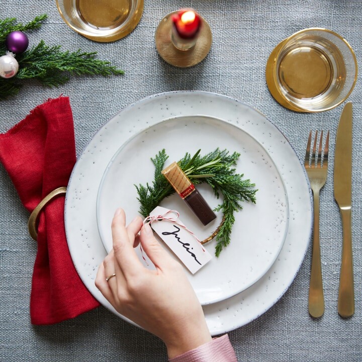 Beschrifte die Anhänger mit den Namen Deiner Gäste oder einer Grußbotschaft. Binde sie dann mit einem Stück Kordel an den Kranz und lege ein merci Stäbchen mittig dazu. Jetzt können Deine Gäste Platz nehmen.