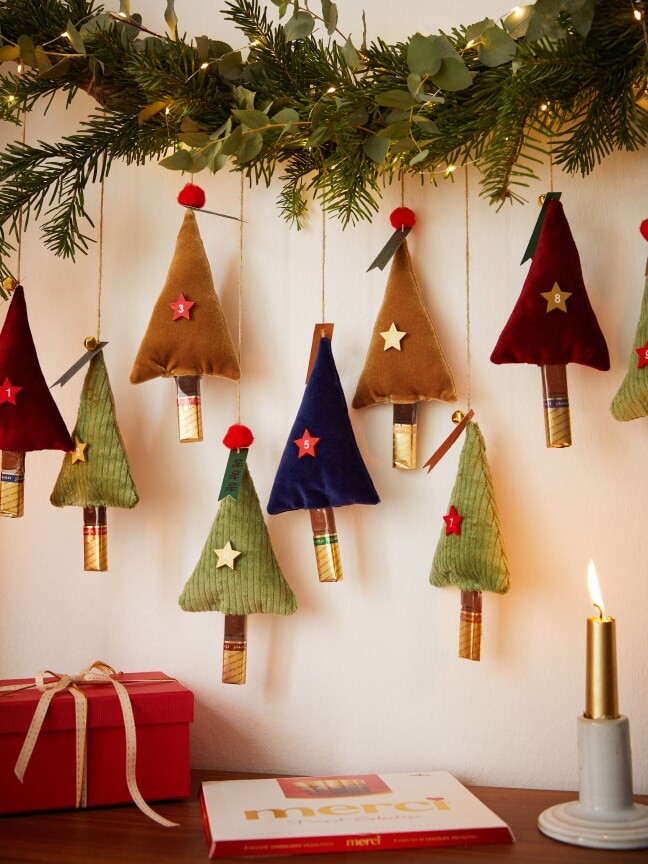 Verschließe den Baum oben und klebe einen ausgestanzten Stern als festlichen Abschluss auf, bevor Du das Bäumchen mit merci Finest Selection Stäbchen befüllst. Fertig ist die Tischdeko!