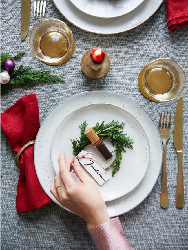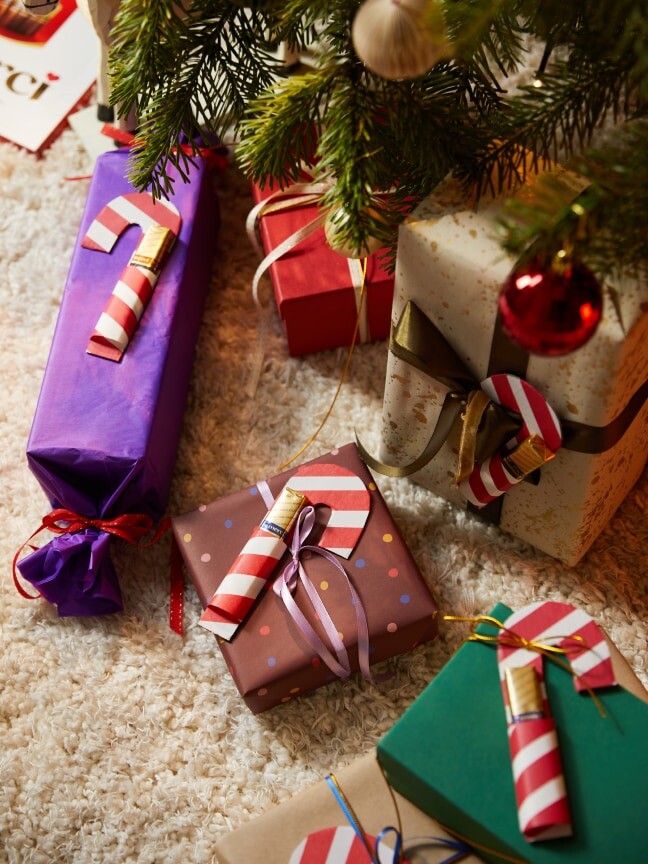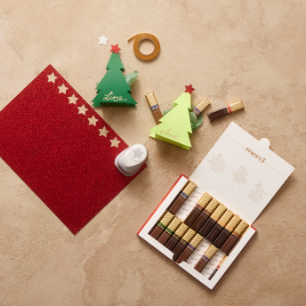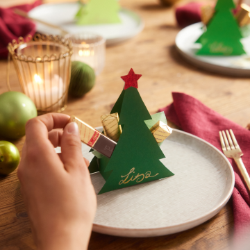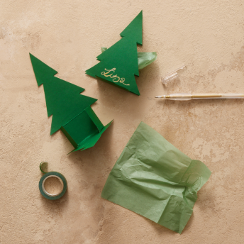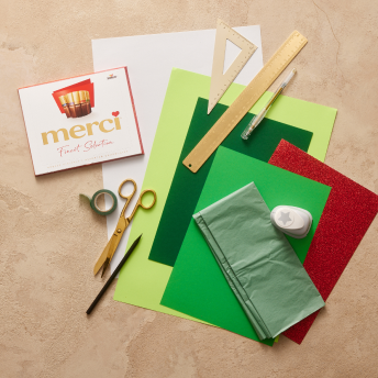 Schneide den Baum auf dem Karton aus und falte die Seiten nach innen. Verziere den Baum mit dem Goldstift für einen festlichen personalisierten Look. Fixiere nun die Innenseiten mit Klebeband, lege Seidenpapier hinein und fülle merci Finest Selection Stäbchen dazu.
